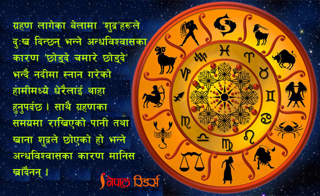 ग्रहण लागेका बेलामा शुद्रहरूले दुःख दिएका भन्ने अन्धविश्वासका कारण ‘छोड्दे चमारे छोड्दे’ भन्दै नदीमा स्नान गरेको हामीमध्ये धेरैलाई थाहा हुनुपर्दछ। साथै ग्रहणका समयमा राखिएको पानी तथा खाना शुद्रले छोएको हो भन्ने अन्धविश्वासका कारण मानिस खाँदैनन्। अथवा शुद्रहरूमाथिको अन्याय ज्योतिषीले पनि कायम राखेकै छन्।