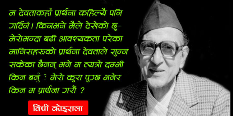 ममाथि धर्मको ठूलो असर परेको छ। तर, कसैले सोधोस्– बिहान नुहाउँछस् कि नुहाउँदैनस् ? जनै लगाउँछस् कि लगाउँदैनस्, टुप्पी छ कि छैन ? आस्तिक हो कि नास्तिक हो ? मलाईं यो निरर्थक लाग्छ। मैले भनिहालेँ म देवताकहाँ प्रार्थना कहिल्यै पनि गर्दिनँ। किनभने मैले देखेको छु– मेरोभन्दा बढी आवश्यकता परेका मानिसहरूको प्रार्थना देवताले सुन्न सकेका छैनन् भने म त्यत्रो दम्भी कि मेरो कुरा पुग्छ भनेर म प्रार्थना गरौं ? त्यो दम्भ मलाई छैन। त्यसो हुनाले मैले देवताकहाँ कहिल्यै पनि प्रार्थना गरिनँ।
