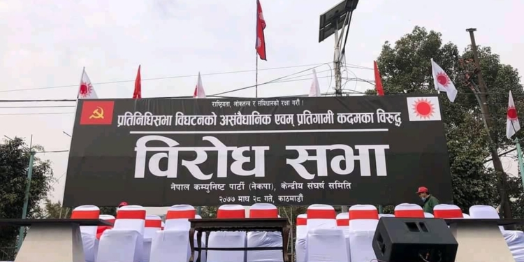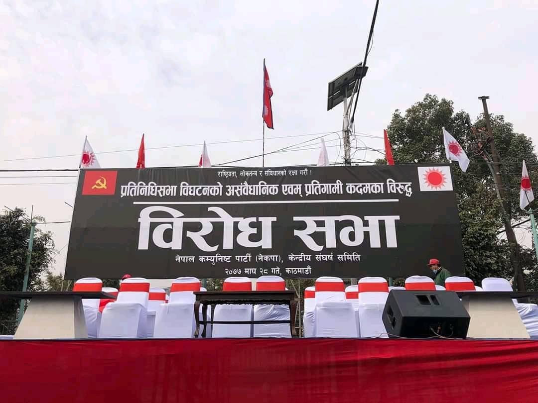नेपाल कम्युनिष्ट पार्टीले प्रतिगमनविरुद्ध आज विरोध प्रदर्शन गर्न भइरहेको छ । देशभरीबाट विरोध प्रदर्शनका लागि नेता कार्यकर्ता आउने क्रम जारी छ । प्रदर्शनीमार्गमा पहिलेजस्तै ‘टी’ आकारमा सभा हुने छ । सभाका लागि पुरानोबसपार्क–भद्रकाली सडकखण्डमा मञ्च निर्माण गरिएको छ । विरोध सभाका कारण उपत्यकाको ट्राफिक व्यवस्थापन पनि प्रभावित भएको छ । यातायातलाई सहज बनाउन प्रहरीले बिहानैदेखि डाइभर्सन गरेर सवारी संचालन गरेको छ ।