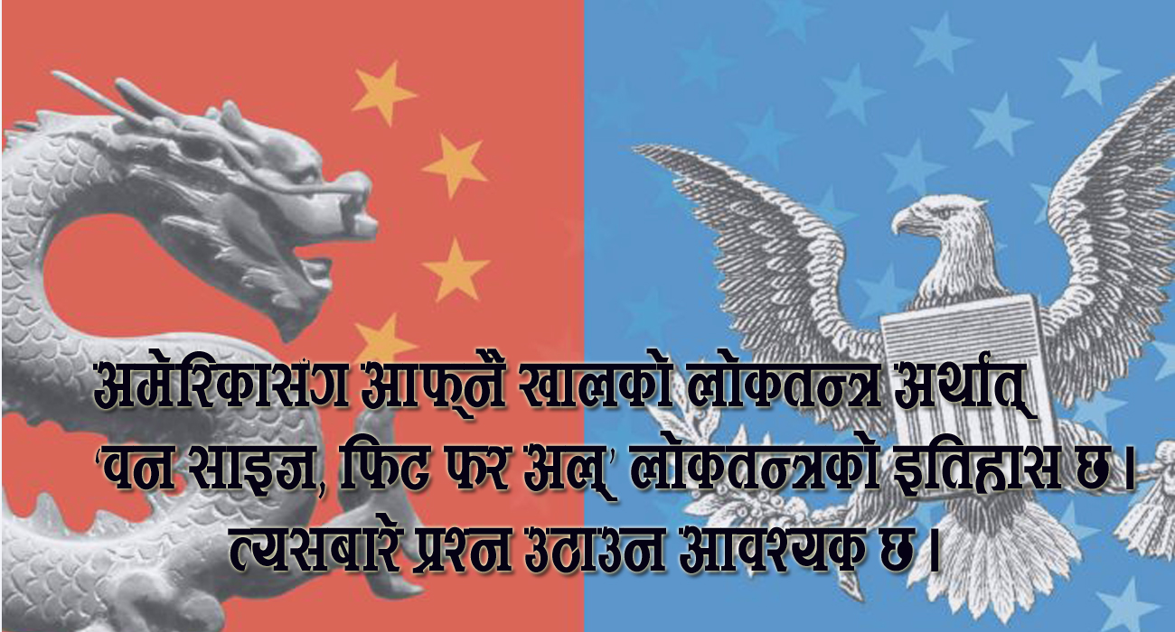 आफ्नै देशमा लोकतन्त्रको खराब स्थितिका बावजूद अमेरिकाले यसखालको शिखर सम्मेलन विश्वसनीय रूपमा आयोजना गर्न गरेको हो वा होइन, यो बहसको विषय हुने नै भयो। तर लोकतन्त्रको सिद्धान्तको चर्को रूपमा वकालत गर्ने र लोकतन्त्रलाई व्यवहारमा उतार्नका लागि भारी सम्झौताका लागि तयार रहेको दाबी गर्ने अमेरिकासँग आफ्नै खालको लोकतन्त्र अर्थात ‘वान साइज, फिट फर अल’ लोकतन्त्रको इतिहास छ। त्यसैले अमेरिका कस्तो खालको लोकतन्त्रलाई प्रवर्द्धन गर्न चाहन्छ र कुन अन्तर्निहित एजेण्डालाई आफ्नो विदेश नीति योजनामार्फत ल्याउन चाहन्छ भन्नेबारे प्रश्न उठाउन आवश्यक छ।