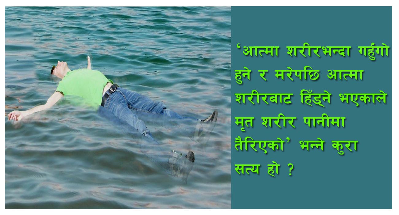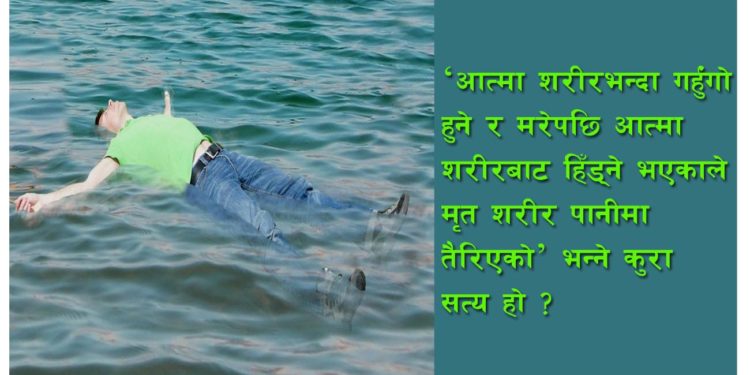 अत : मृत शरीर पानीमा डुब्नुमा त्यसबाट निस्कने अनेक ग्याँस र त्यसको घनत्व नै कारक हो। गर्हुंगो श्वास या आत्मा उडेर गएकाले शरीर पानीमा डुब्ने होइन। यस्ता हौवा र हल्लाहरूमा नपरौँ। विज्ञान बुझौँ।