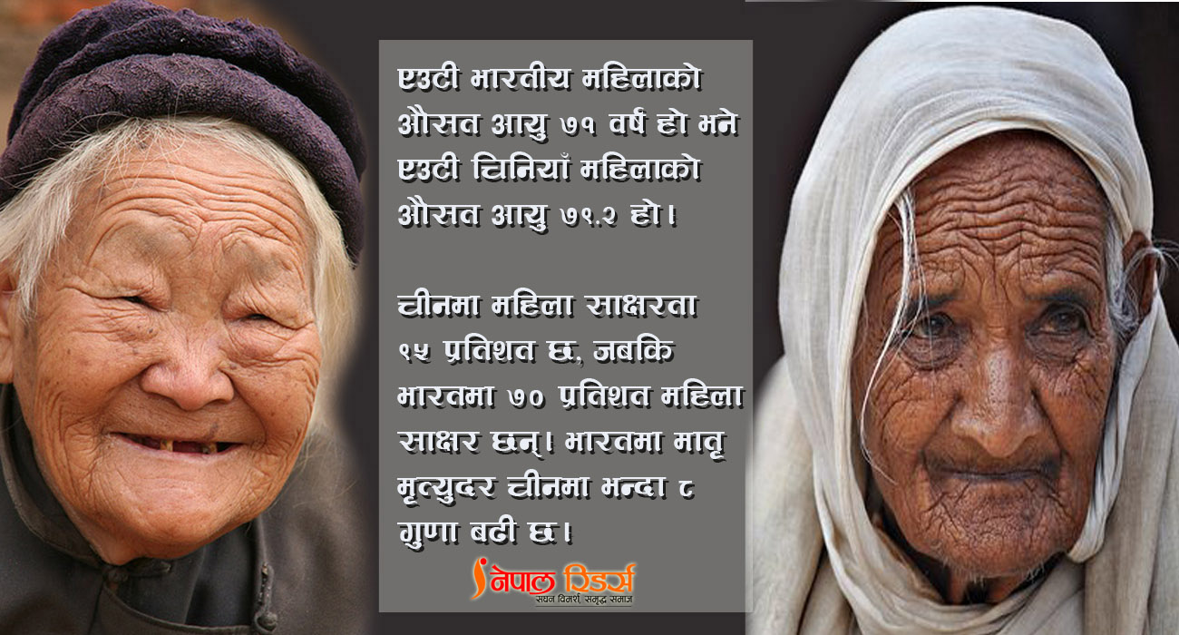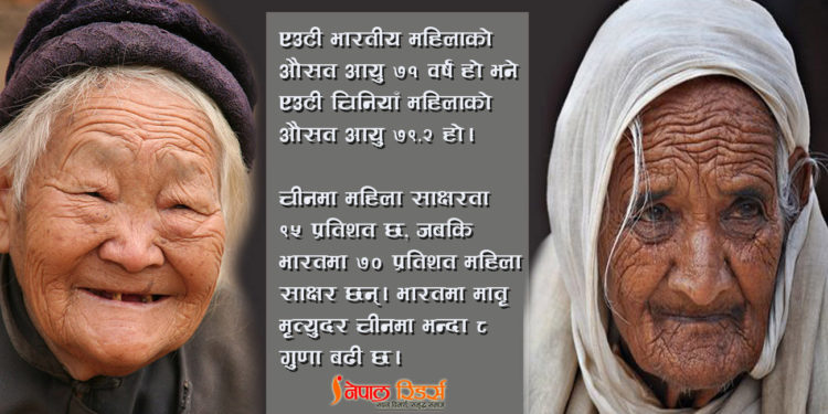 एउटी भारतीय महिलाको औसत आयु ७१ वर्ष रहेको छ भने एउटी चिनियाँ महिलाको औसत आयु ७९.२ छ। चीनमा महिला साक्षरता ९५ प्रतिशत छ, जबकि भारतमा ७० प्रतिशत महिला साक्षर छन्। भारतमा मातृ मृत्युदर चीनमा भन्दा ८ गुणा बढी छ।