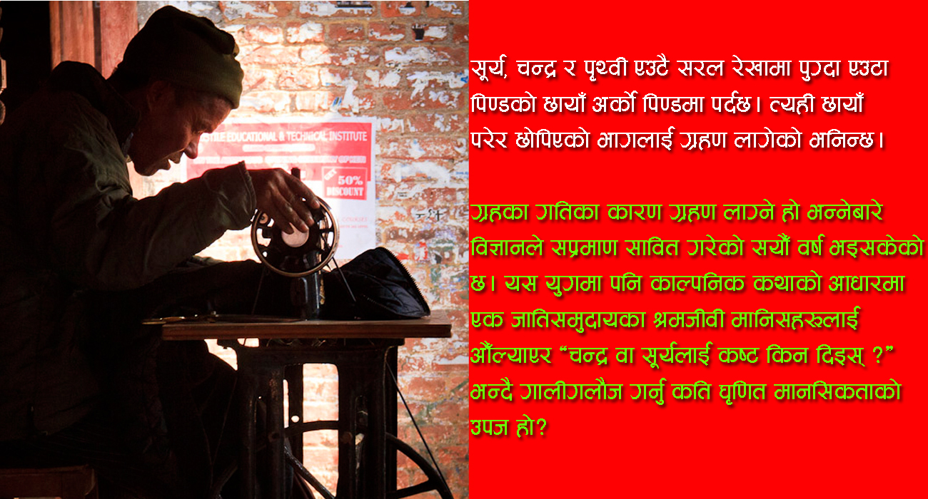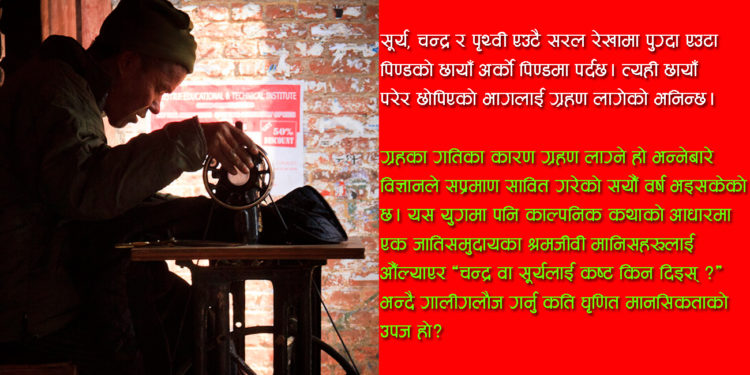 सूर्य वा चन्द्र ग्रहण लाग्दा सार्कीले सूर्य वा चन्द्रलाई कष्ट दिएको भनेर ‘छोड चमार’ भन्दै एउटा जाति वा समुदायलाई गाली गर्नुजस्ता परम्पराहरू विद्यमान छन् हाम्रो समाजमा । सूर्य, चन्द्र र पृथ्वी एउटै सरल रेखामा पुग्दा एउटा पिण्डको छायाँ अर्को पिण्डमा पर्दछ । त्यही छायाँ परेर छोपिएको भागलाई ग्रहण लागेको भनिन्छ । ग्रहका गतिका कारण ग्रहण लाग्ने हो भन्नेबारे विज्ञानले सप्रमाण सावित गरेको सयौँ वर्ष भइसकेको छ । आजको युगमा आएर पनि काल्पनिक कथाको आधारमा एक जातिसमुदायका श्रमजीवी मानिसहरूलाई आैँल्याएर ‘चन्द्र वा सूर्यलाई कष्ट किन दिइस् ?’ भन्दै गालीगलौज गर्नु, कुटपिटसम्मको ज्यादती गर्नु कति घृणित मानसिकताको उपज हो ?