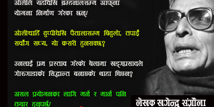 मलाई खाली ओली प्रवृत्तिप्रति बिरोध छ। ६२/६३ को आन्दोलनमा म सधैं सडकमा थिएँ। बयलगाडाको जन्म त्यहीबेला भएको थियो। बयलगाडाको चोट, त्यसको मर्म, त्यसको प्रहार मलाई थाहा छ। बयलगाडा त्यो चीज हो, जसले खड्गप्रसाद ओलीको रचनागर्भ बताउँछ। कविहरू रचनागर्भका कुरा गर्छन् नी। ओलीको रचनागर्भ के हो? बयलागाडा हो। मैले बीचमा एउटा वाक्य प्रयोग गरिनँ, धेरै पटक दोहोर्‍याइनँ। तपाईंले बाँदरलाई मकैको गोठालो बनाउनुभयो के हुन्छ। यस्तै हुन्छ। खड्गप्रसाद नामको बाँदरलाई तपाईंले मकै बारीको गोठालो बनाउनुभयो। अनि तपाईं खड्गप्रसादले मेरो बारीको मकै जोगाइदिएन भनेर किन रूनु हुन्छ?
