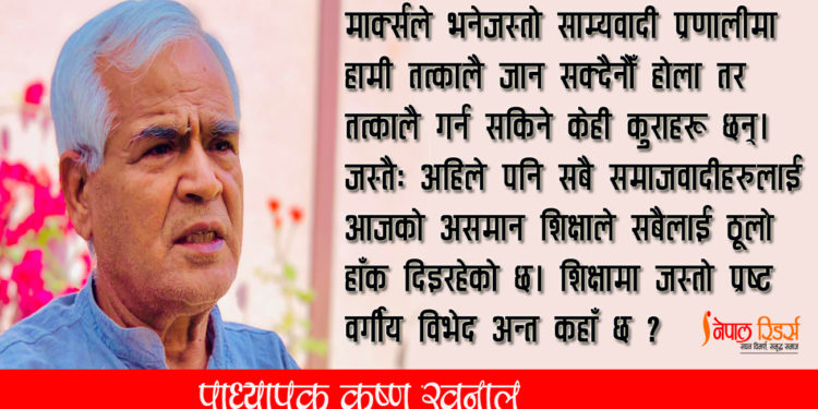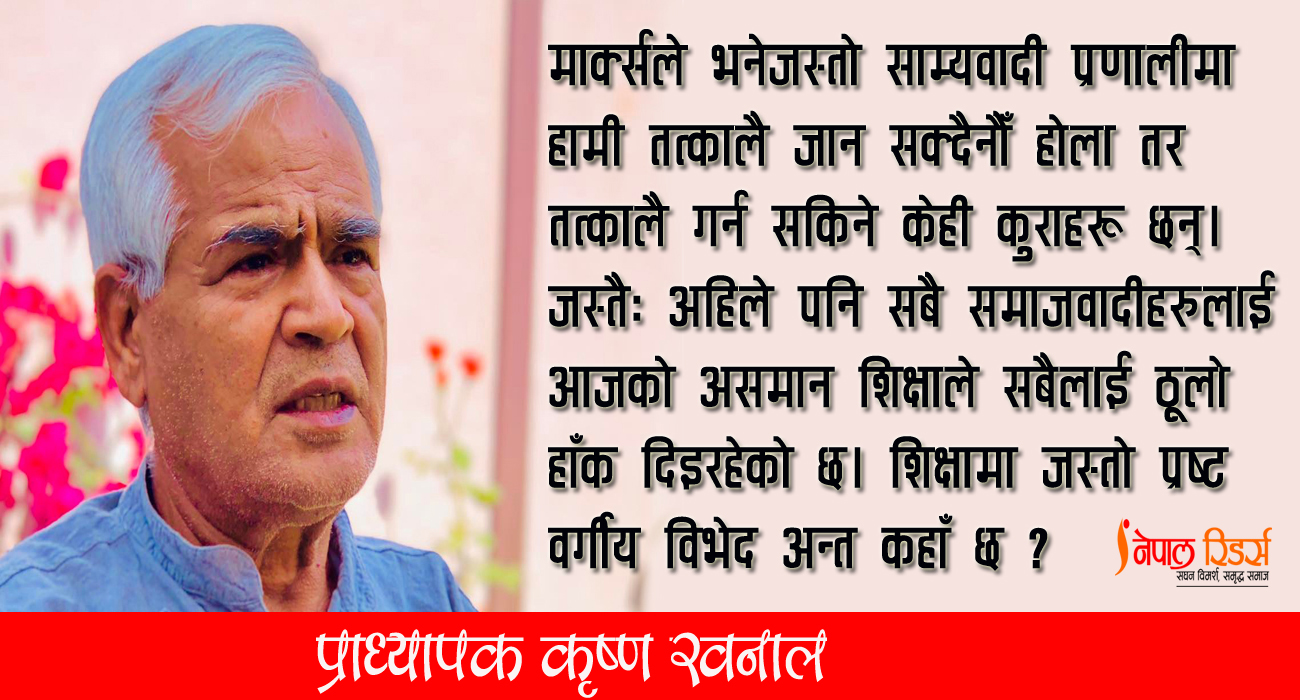 र, यदि कम्युनिष्ट पार्टीहरूले राम्रो राजनीति गर्ने हो भने नेपालकै धरातलमा उभिन जरुरी छ। नेपालमै उभिएर राजनीति गर्ने हो भने नेपाली कम्युनिष्ट पार्टीहरू द्वन्द्वबाट मुक्त हुनसक्लान्। र, अहिले स्थापित प्रणाली र संवैधानिक सीमाभित्रै रहेर गर्न सक्ने ससाना कामहरू केके हुनसक्छन्? मार्क्सले भनेजस्तो साम्यवादी प्रणालीमा हामी तत्कालै जान सक्दैनौँ होला, सबै उत्पादनलाई एकैपटक मजदुर वर्गसम्म पुर्याउन सक्दैनौँ होला। त्यो गर्न गाह्रो होला। तर गर्न सक्ने कुरा के के छन् त? गर्न सक्ने केही कुराहरू त छन्। जस्तैः अहिले पनि नेपालमा समातामूलक समाजको कुरा गर्ने कम्युनिष्ट र सोसलिस्टहरू सबैलाई ठूलो हाँक दिइरहेको छ आजको असमानपूर्ण शिक्षाले। शिक्षामा जस्तो वर्गीय विभेद कहाँ छ अहिले?
