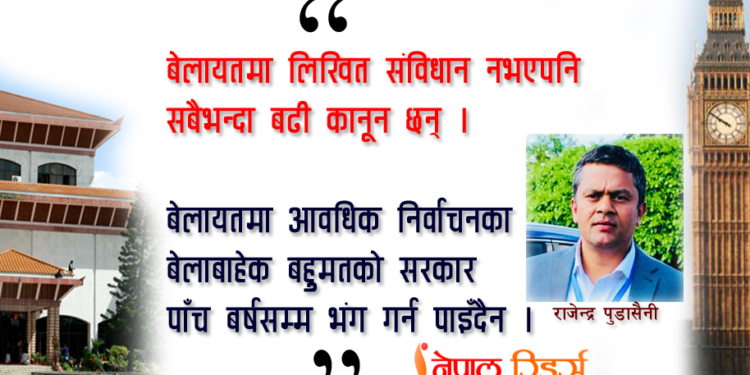 नेपालमा यस पटक बहुमत रहँदा-रहँदैको अवस्थामा प्रधानमन्त्रीले सिफारिस गरेको एकाध घण्टामै राष्ट्रपतिद्वारा संसद विघटन सदर गरियो। संसदमा आफ्नो पार्टीको बहुमत हुँदाहुँदै गरिएको संसदको हत्याको यो बिषयको हरेक कोणबाट यसर्थ पनि चर्चा पाइरहेको छ। अदालत र निर्वाचन आयोग मात्र नभएर राज्यका धेरै अंग र मुलुकको भविष्यसँग पनि अब यो बलपूर्वक अघि बढाइएको घटना जोडिन पुगेको छ। यो बिषय र यससँग जोडिएका घटनाक्रमका बिषयमा राजनीतिक, कानूनी र नैतिक कोणका बहस बढी घनीभूत भएका छन्। प्रधानमन्त्री ओलीको कदमको पक्षमा नै वकालत गर्नेहरुले पनि टेकेको आधार भनेको बेलायती प्रणाली हाे। जुन सर्वथा हाँस्यास्पद र कुतर्कमा आधारित देखिन्छ।