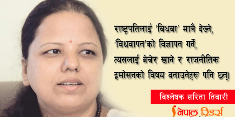 ती समुदाय दलहरूमा बाँडिएका छन्, छरिएका छन् । ती समुदायहरू ओलीतन्त्रमा समर्थक भएर हिँडेका छन् । दलितहरू पनि ओली समर्थक भएर हिँडेका छन् । महिलाहरू पनि छन् जो ‘राष्ट्रपति ठिक हुनुहुन्छ, राष्ट्रपति सही हो र राष्ट्रपतिलाई जोगाउनुपर्छ’ भन्दै हिँडेका छन् । राष्ट्रपतिले आफ्नो पदीय मर्यादा समेत बिर्सेर गरेका गतिविधिहरूलाई पनि समर्थन गर्ने र राष्ट्रपतिलाई ‘विधवा’ मात्रै देख्ने र त्यो विधवापनको विज्ञापन गर्ने, त्यसलाई बेचेर खाने र राजनीतिक ‘इमोसन’को विषय बनाउने महिलाहरू पनि छन् ।