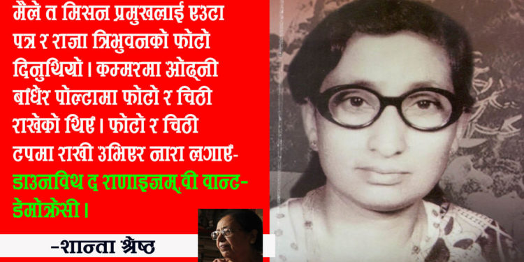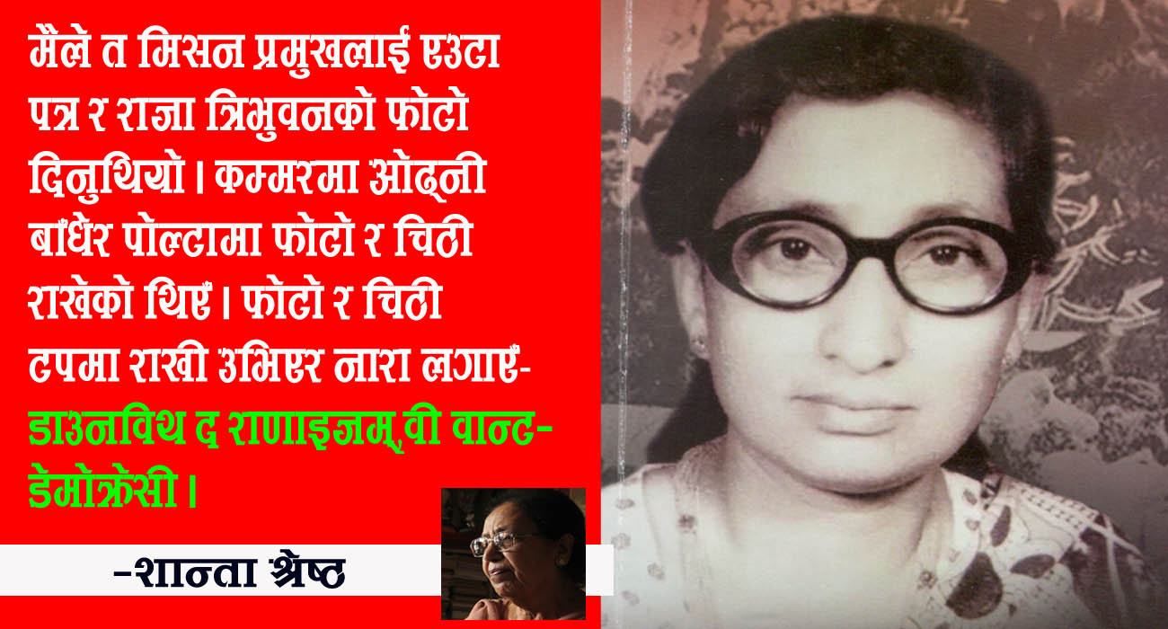 मैले भाग्दै गरेका जनतालाई आह्वान गर्दै भनेँ, ‘कमिसन कायर हो, डराउनु पर्दैन। फर्केर आउनुस् ! फर्केर आउनुस् !’ सयौँ जना फर्केर आएपछि फेरि लाठीचार्ज भयो। सयौँ प्रदर्शनकारी घाइते भएका थिए। प्रहरीको लाठीले मेरो टाउको फुटेर म त्यहीँ बेहोस भएँ। होसमा आउँदा म मिसन बसेको सेतो कारको टपमा थिएँ। अरू दुईजना ८–९ वर्षका बालक पनि थिए। मैले सम्झेँ–मैले त मिसन प्रमुखलाई एउटा पत्र र राजा त्रिभुवनको फोटो दिनु थियो। ओढनी कम्मरमा बाँधी पोल्टामा राखेकी थिएँ। फोटो र चिठी टपमा राखी उभिएर नारा लगाएँ– ‘डाउनविथ– द राणाइजम्, वी वान्ट– किङ्ग त्रिभुवन, वी वान्ट – डेमोक्रेसी।’ मिसन प्रमुखलाई त्रिभुवनको फोटो र पत्र दिने जिम्मेवारी मैले सफलतापूर्वक निर्वाह गर्न सकेकी थिएँ।