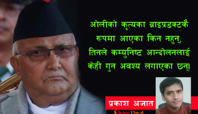 यति हुँदाहुँदै पनि हामीले ओलीको अहंकारको उदयलाई उनकै मात्रै टाउकामा थोपर्नु चाहिँ सही हुन्न। किनकि उनी पनि यही समाज र नेपाली कम्युनिष्ट आन्दोलनका उत्पादन हुन्। हाम्रै कमजोरीहरूको जगमा उनी उम्रेका हुन्। र, अर्को कुरा, तमाम बदनामी र खराबीका बाबजुद ओलीले सत्तामा रहँदा गरेका एकाध निर्णयहरू ऐतिहासिक महत्वका पनि छन्। उनको खराबीलाई उधिन्दै गर्दा उनका थोरै असल कुराहरूलाई आगामी दिनमा ग्रहण गरेर अघि बढ्न सके त्यसले नेपाली समाज र हितै गर्ला। त्यसका लागि पनि ओलीलाई धन्यवाद।