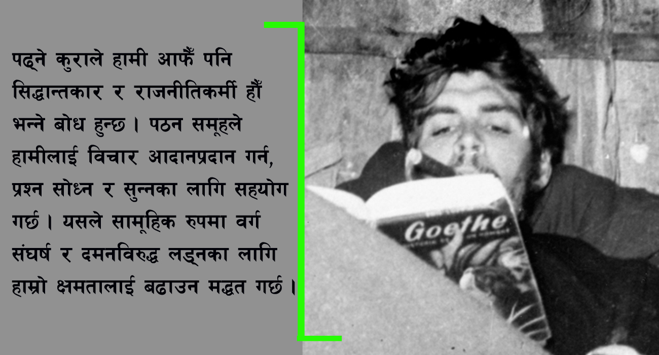 पढ्नुका साथै आपसमा छलफलको माध्यमबाट हामी इतिहास र वर्तमानलाई जोड्न सक्छौं र कहिलेकाहीँ हामी सहभागी भएका भिन्नभिन्न संघर्षहरूलाई एक ठाउँमा ल्याउन सक्छौँ। झट्ट सुन्दा, पढाई एकल प्रयास होजस्तो लाग्छ। तर जब हामी सामूहिक सघर्षको ‘प्रिज्मा’बाट पढ्छौं र संगठित हुन्छौं, यसले प्रश्न, विचार र सम्भावनाहरूको नयाँ संसारको ढोका खोलिदिन्छ। राजनीतिक परिवर्तन र राजनीतिक विकासका लागि समाजमा हाम्रो अमूल्य स्थान छ। सामूहिक अध्ययनले हाम्रा लक्ष्यहरू सामूहिक आधारमा पूरा गर्ने अवसर पनि दिन्छ।